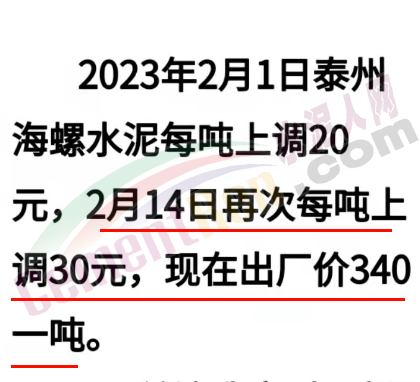 江蘇泰州海螺2月14日再上調(diào)30元/噸,本月內(nèi)兩次上調(diào),累計(jì)上調(diào)50元/噸,上調(diào)后出廠報(bào)價(jià)340元/噸。