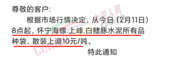 2月11日安徽懷寧海螺、上峰、白鱀豚水泥所有品種袋、散裝水泥上調(diào)10元/噸。