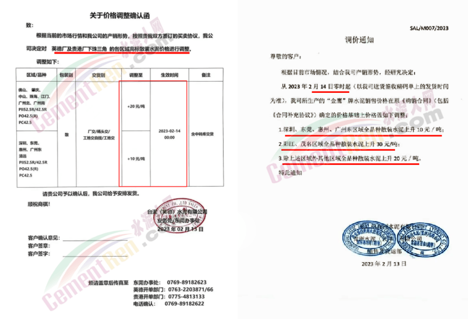 臺泥(英德)公司通知針對廣東省全區域熟料價格自2月9日起上調10元/噸;深圳、東莞、惠州、廣州東各標號散裝水泥上調10元/噸,散裝水泥中轉庫交貨同步上調。