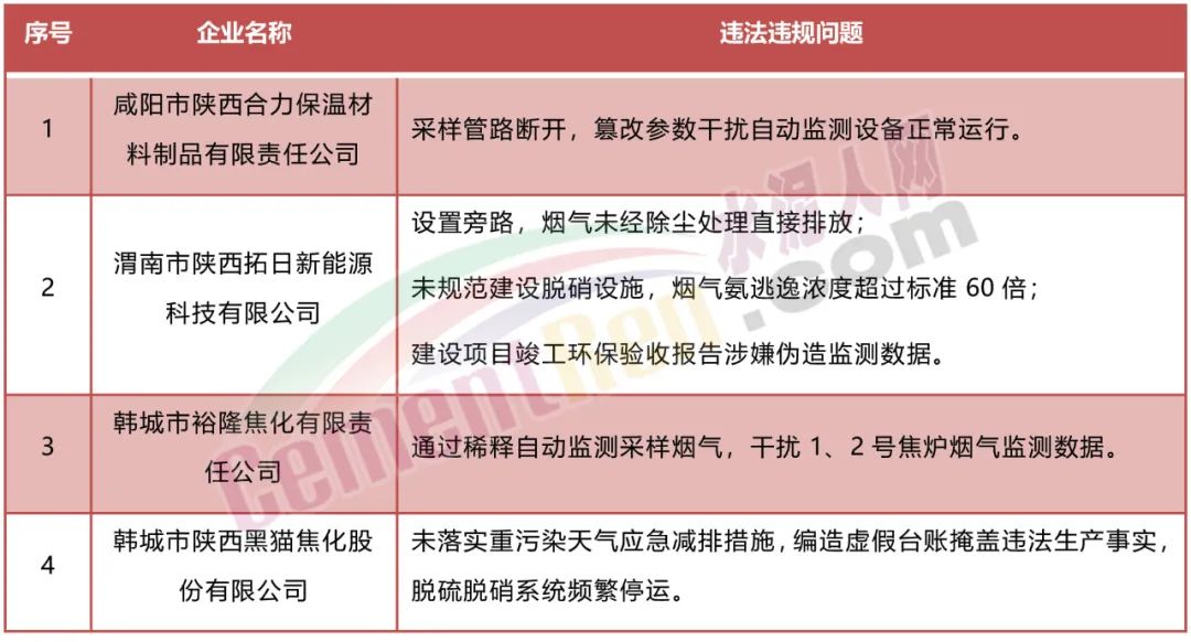 2月21日~22日,生態環境部副部長趙英民帶隊赴陜西省咸陽市、渭南市和韓城市等空氣質量明顯反彈城市監督幫扶,對涉氣重點企業開展“四不兩直”督導檢查發現4家企業問題突出: