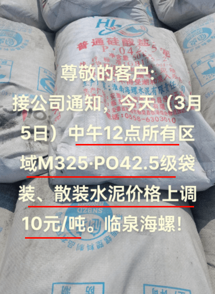 3月5日前后,海螺水泥經銷商通知,發往溫州市場水泥價格上調20-30元/噸,其中M32.5包裝水泥上調20元/噸、P.O42.5袋裝水泥上調30元/噸。