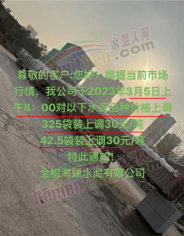 祁陽海螺水泥有限責任公司通知,根據當前市場形勢及公司產銷情況,公司經研究決定從2023年3月6日8時起對各標號水泥上調20-30元/噸。