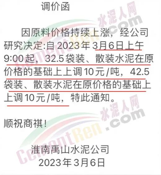 淮南市盤龍水泥、淮南禹山水泥公司、淮礦水泥廠、沿淮水泥廠通知,自3月6日起,水泥價格上調10元/噸。