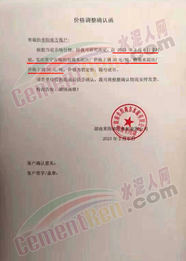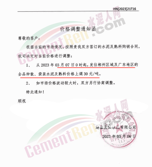 康達(湖南)水泥有限公司銷售服務科通知,根據當前市場行情,經公司研究決定,自2023年3月7日上午7時起,湖南地區所有規格品種水泥價格在原基礎上上調30元/噸,廣東地區所有規格品種水泥價格在原基礎上上調20元/噸。