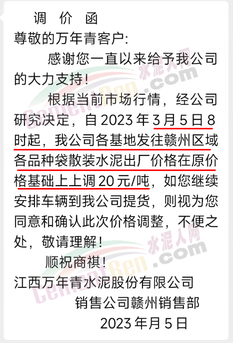 江西萬年青水泥贛州銷售部通知,根據當前市場行情,經公司研究決定,自2023年3月5日8時起,各基地發往贛州區域各品種袋散裝水泥出廠價格在原價格基礎上上調20元/噸。