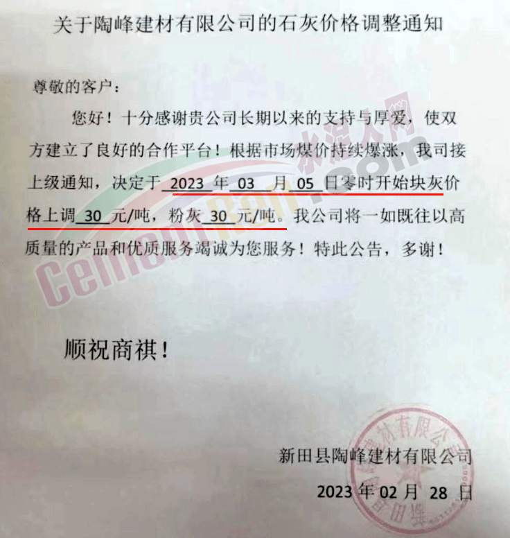 新田縣陶峰建材有限公司通知,定于2023年3月5日0時開始塊灰價格上調30元/噸,粉灰30元/噸。