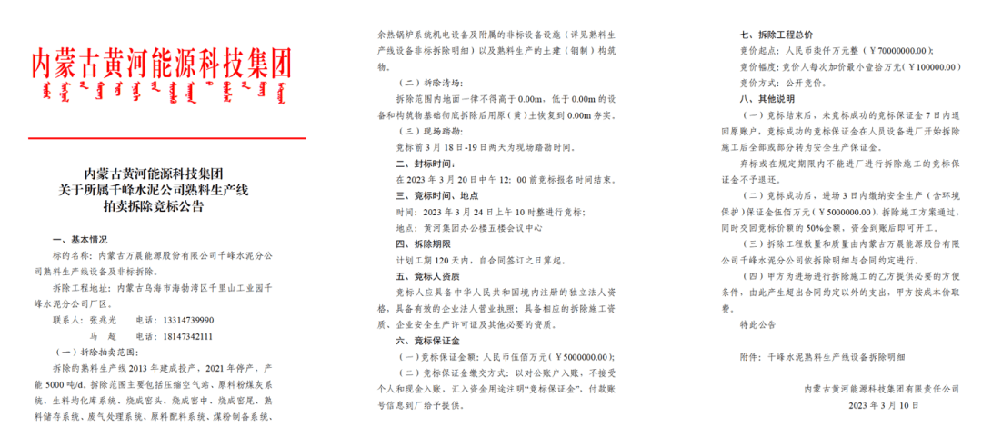 日前,內蒙古黃河能源科技集團發布《關于所屬千峰水泥公司熟料生產線拍賣拆除競標公告》公開內蒙古萬晨能源股份有限公司千峰水泥分公司熟料生產線設備及非標拆除。