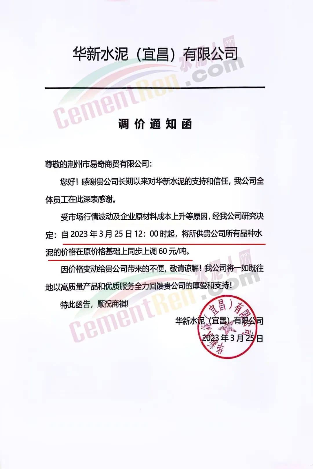 華新水泥(宜昌)有限公司通知,受市場行情波動及企業原材料成本上升等原因,經公司研究決定,自2023年3月25日12:00時起,將公司所有品種水泥的價格在原價格基礎上同步上調60元/噸。