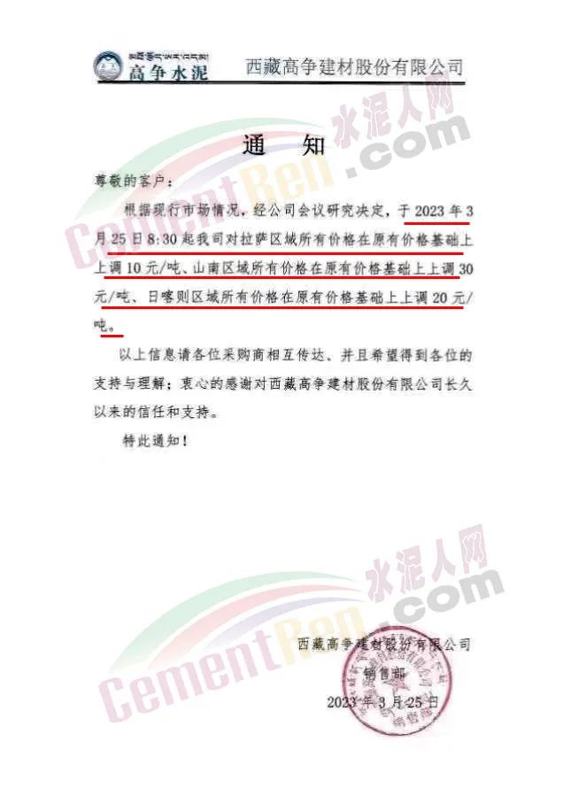 西藏高爭建材股份有限公司通知,根據現行市場情況,經公司會議研究決定,于2023年3月25日8:30起公司對拉薩區域所有價格在原有價格基礎上上調10元/噸;山南區域所有價格在原有價格基礎上上調30元/噸、日喀則區域所有價格在原有價格基礎上上調20元/噸。