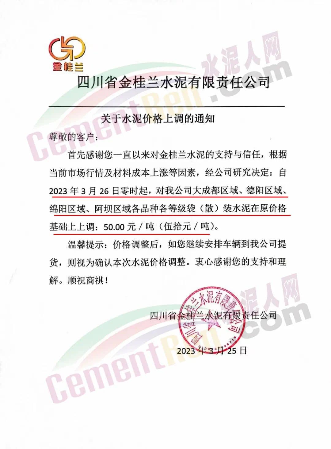 四川省金桂蘭水泥有限責任公司通知,根據當前市場行情及材料成本上漲等因素,經公司研究決定,自2023年3月26日零時起,對公司大成都區域、德陽區域綿陽區域、阿壩區域各品種各等級袋(散)裝水泥在原價格基礎上上調50元/噸。