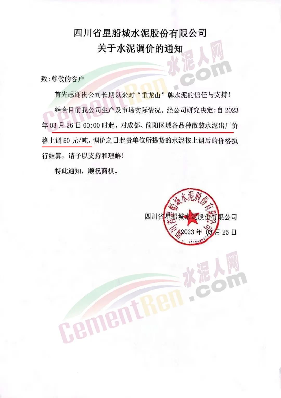 四川星船城水泥股份有限公司通知,自2023年03月26日0時起,對成都簡陽區域各品種散裝水泥出廠價格上調50元/噸。