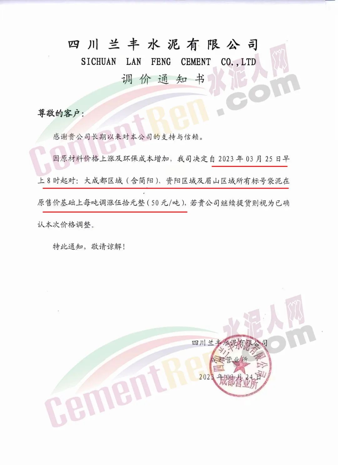 四川蘭豐水泥有限公司通知因原材料價格上漲及環保成本增加,公司決定自2023年03月25日早上8時起,對大成都區域(含簡陽)、資陽區域及眉山區域所有標號袋泥在原售價基礎上每噸調漲50元/噸。