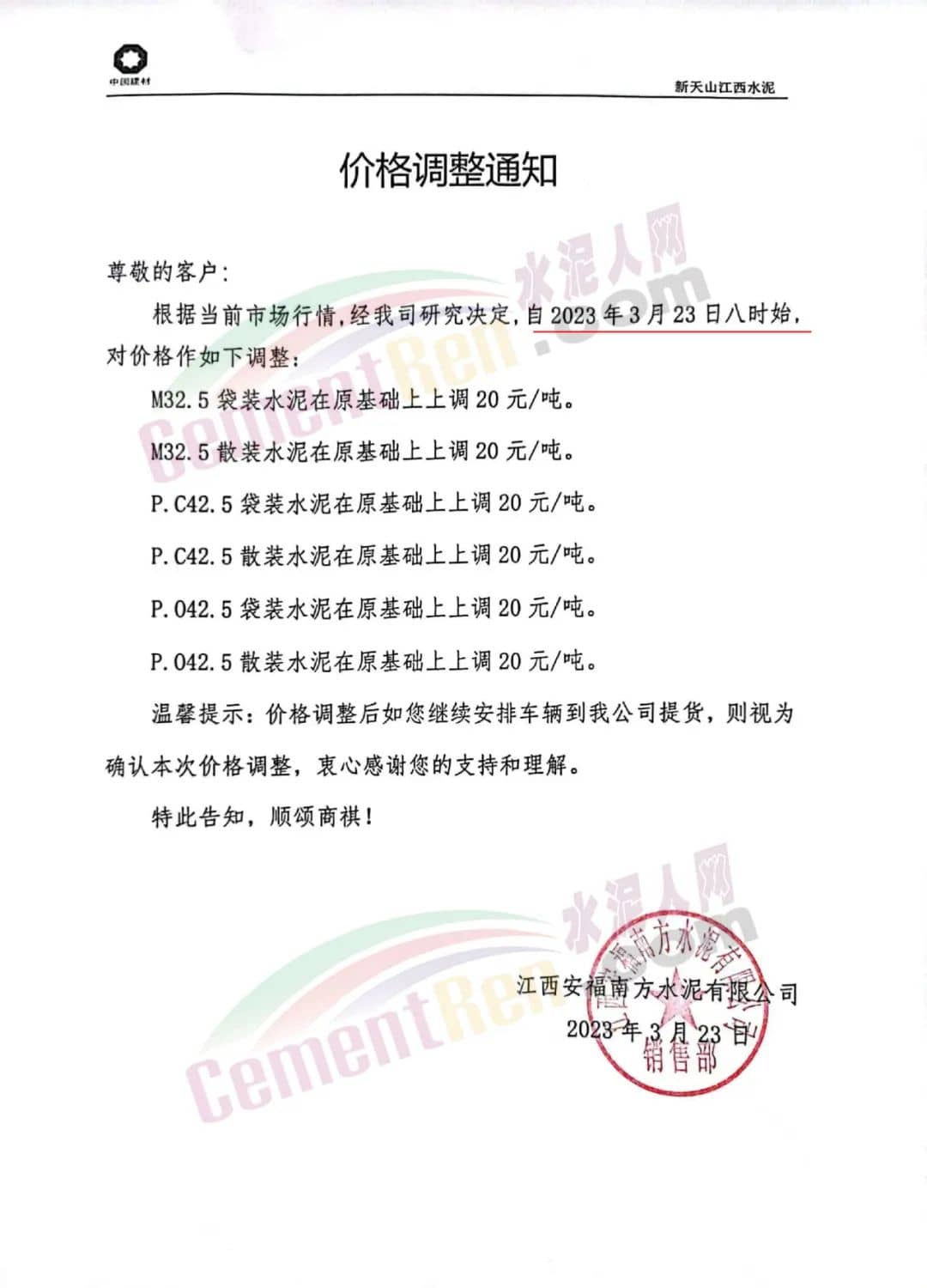 江西安福南方水泥有限公司通知,根據當前市場行情,經公司研究決定,自2023年3月23日八時對各標號水泥價格在原基礎上上調20元/噸。
