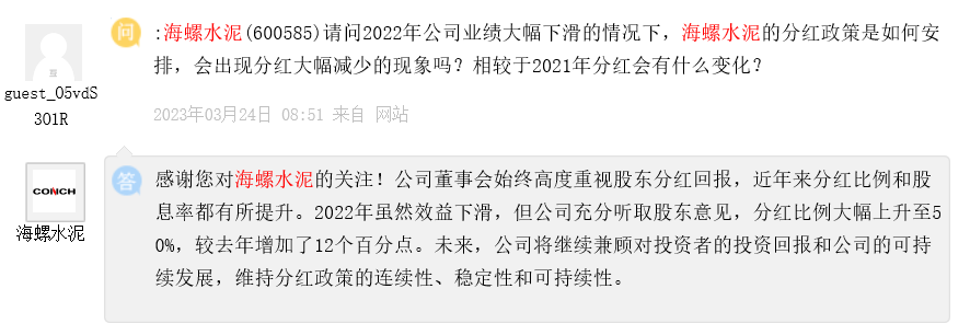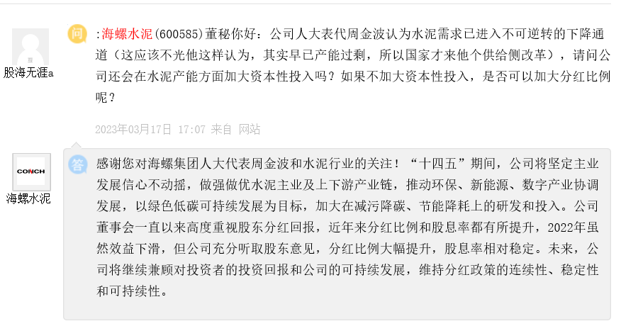 海螺水泥回復稱,“十四五”期間,公司將堅定主業發展信心不動搖,做強做優水泥主業及上下游產業鏈,推動環保、新能源、數字產業協調發展,以綠色低碳可持續發展為目標,加大在減污降碳、節能降耗上的研發和投入。公司董事會一直以來高度重視股東分紅回報,近年來分紅比例和股息率都有所提升。2022年雖然效益下滑,但公司充分聽取股東意見,分紅比例大幅上升至50%,較去年增加了12個百分點。