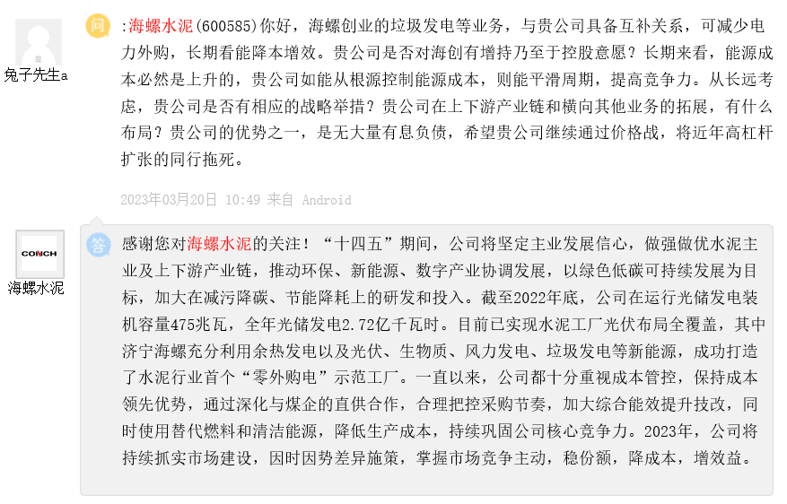 海螺水泥回復稱,2023年,公司將繼續深耕水泥主業,抓實市場建設,因時因勢差異施策,掌握市場競爭主動,穩份額,降成本,增效益。
