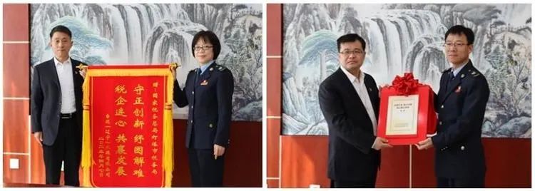 金隅冀東水泥遼寧區域黨委書記閆海峰向燈塔市稅務局贈送錦旗,燈塔市稅務局副局長張毅向臺泥(遼寧)水泥有限公司贈送稅收宣傳資料。