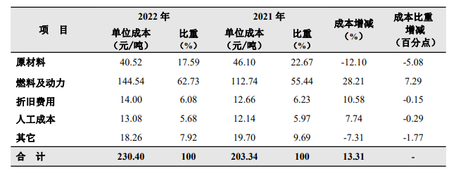 2022年海螺水泥水泥熟料綜合成本同比上升13.31%。水泥熟料綜合成本中燃料及動力、折舊費用及人工成本均有所增加。其中,受煤炭價格及電價上漲影響,燃料及動力成本增加28.21%,成本比重增加7.29%。