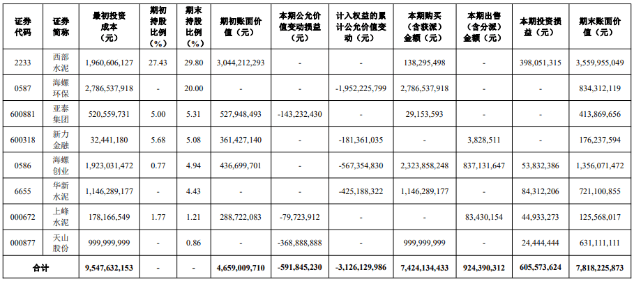 同期,海螺水泥認購西部建設股份事項仍在進行中。截至2022年末,海螺水泥證券投資情況如下: