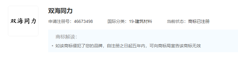 據(jù)查詢“雙海同力”品牌注冊(cè)已于2021年2月7日通過,目前在有效期內(nèi)。注冊(cè)商標(biāo)申請(qǐng)人為西平縣瑞平水泥粉磨有限公司。