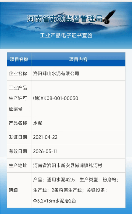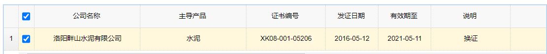 據(jù)查詢,生產(chǎn)許可證編號(hào)XK08-001-06236,對(duì)應(yīng)生產(chǎn)企業(yè)為洛陽中聯(lián)水泥有限公司,該編號(hào)許可證有效期已于2021年1月12日截止。