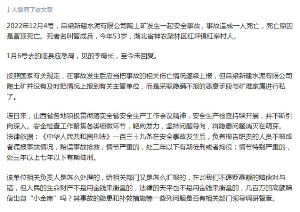 1月中旬,呂梁新建水泥公司一陶土礦發生冒頂事故,致1人死亡,因涉嫌瞞報被曝光。
