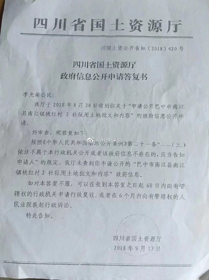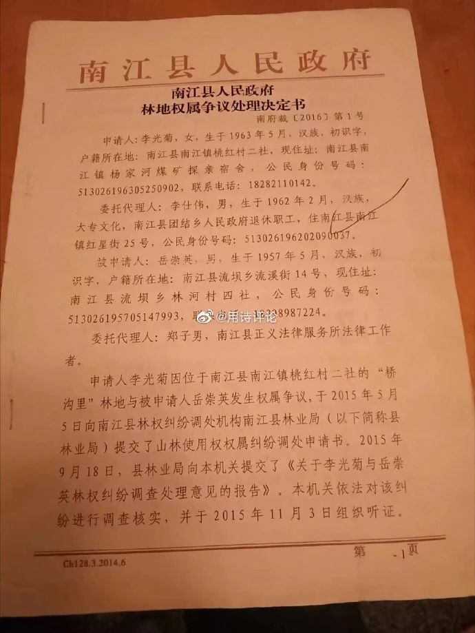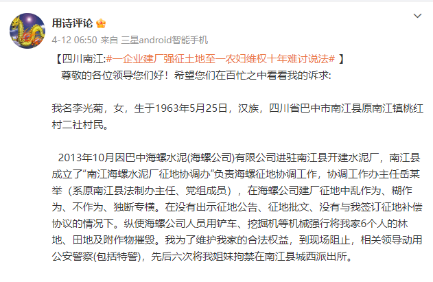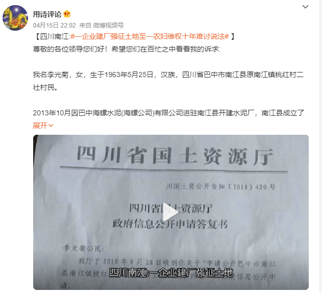 日前,網(wǎng)友“@用詩評論”在社交媒體發(fā)布了一則“四川南江一企業(yè)建廠強征土地致一農婦維權十年難討說法”的消息。