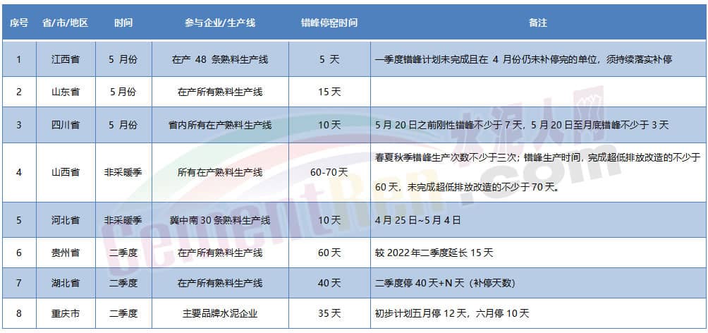 湖南省水泥協(xié)會《關(guān)于2023年二季度增加5天錯峰停窯的通知》要求一、二季度在原有35天基礎(chǔ)上增加5天錯峰停窯時間,其中一季度未停窯到位的單位在二季度補停到位,即二季度停40天+N天(補停天數(shù))。