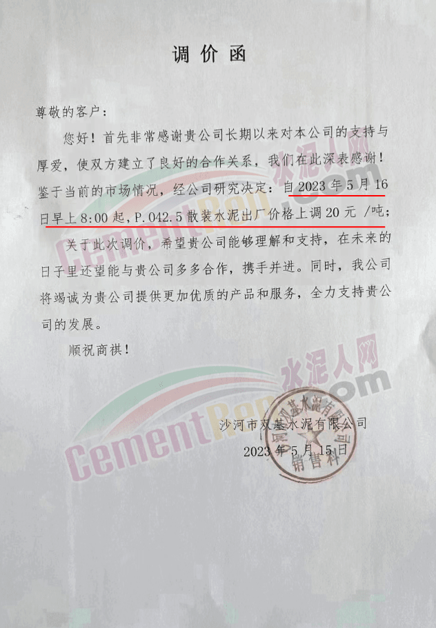 沙河雙基水泥有限公司通知,自5月16日早8時起,P.O42.5散裝水泥出廠價格上調20元/噸。