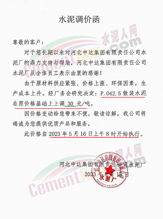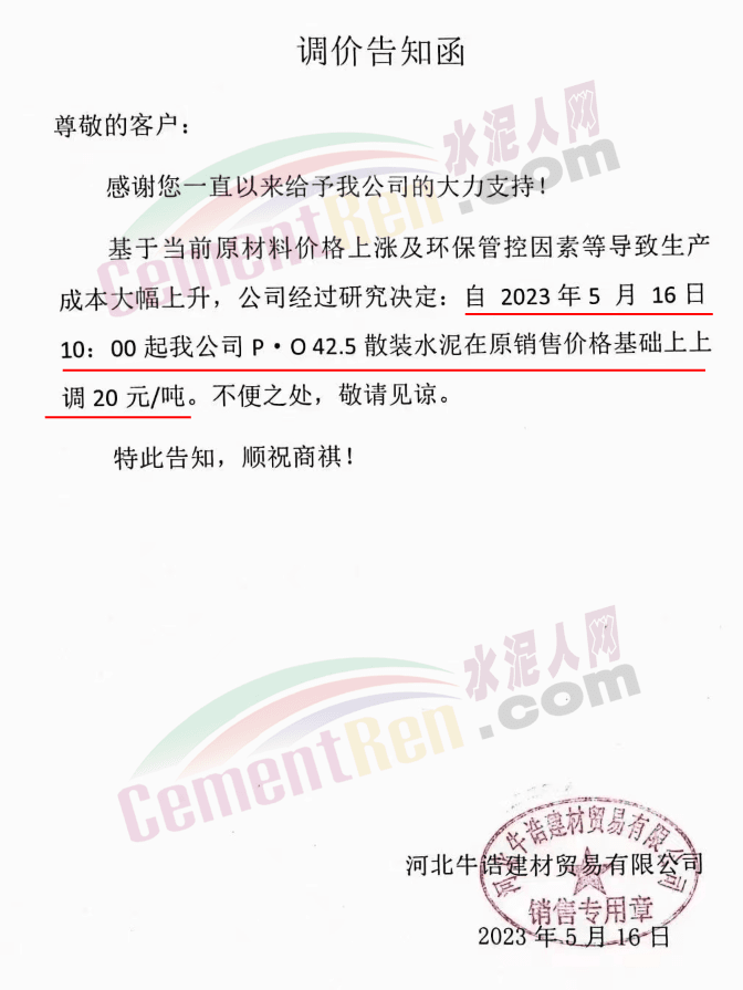 河北牛誥建材貿易有限公司通知,基于當前原材料價格上漲及環保管控因素等導致生產成本大幅上升,公司經過研究決定:自5月16日10時起,P.O42.5散裝水泥上調20元/噸。
