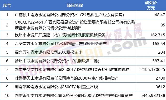 10個已成交項目中,除廣西賓陽縣昆侖資產投資發(fā)展有限責任公司持有的黎塘暨陽水泥有限公司債權公開轉讓及紹興萬年青水泥有限公司20%股權轉讓外,其他均為機器設備或生產線閑置資產。且主要為中國建材集團旗下南方水泥、天山水泥、中聯水泥等企業(yè)閑置資產。