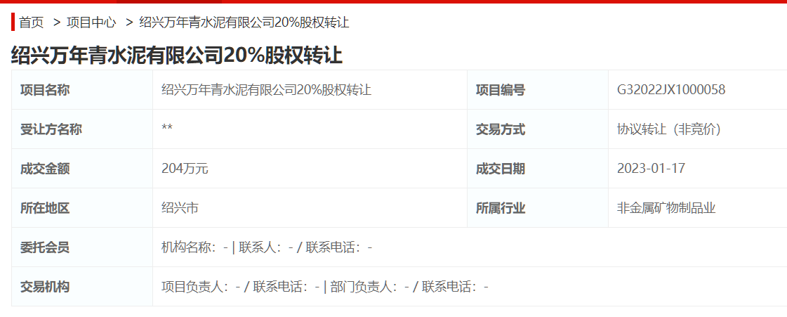 水泥人網注意到紹興萬年青水泥有限公司20%股權轉讓項目是以協議轉讓(非競價)方式成交,成交金額204萬。