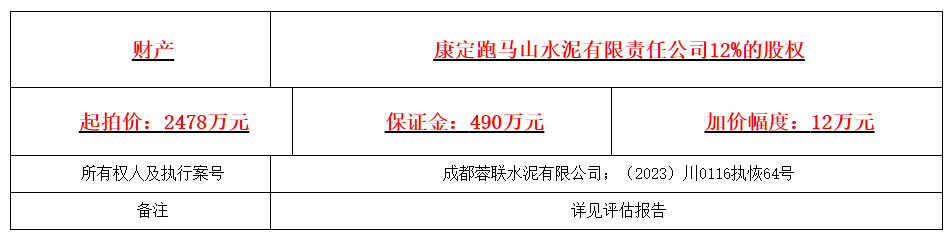 3月29日,成都市雙流區(qū)人民法院發(fā)布拍賣公告(川0116執(zhí)恢64號)提到定于5月4日10時至5月5日10時在京東網司法拍賣網絡平臺公開拍賣涉案財產。拍賣財產為康定跑馬山水泥有限責任公司12%的股權,起拍價2478萬元。