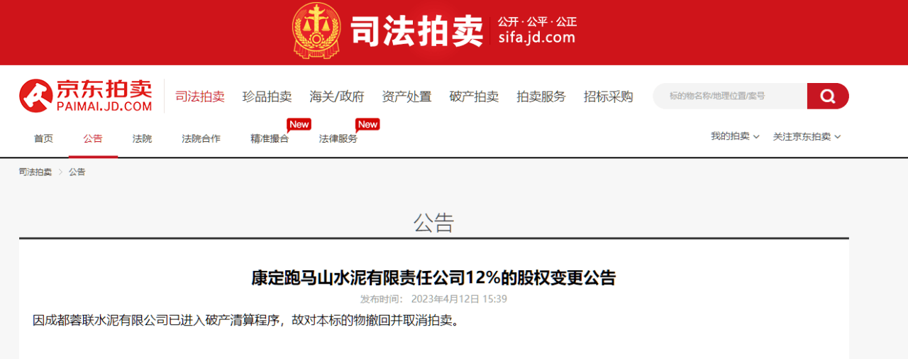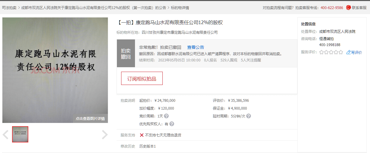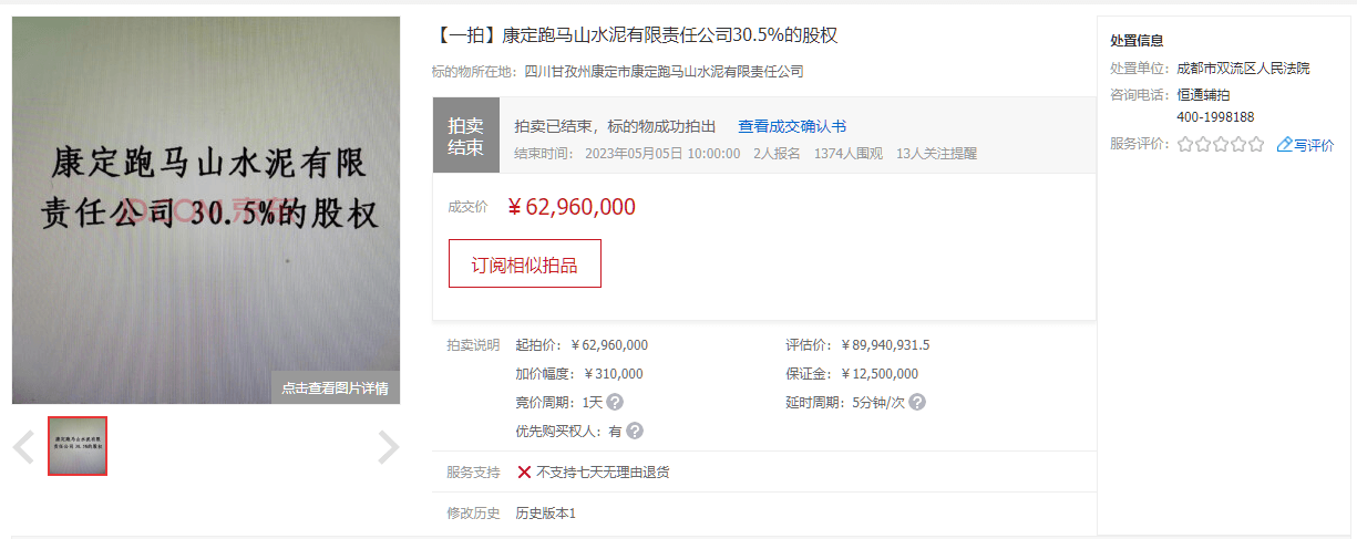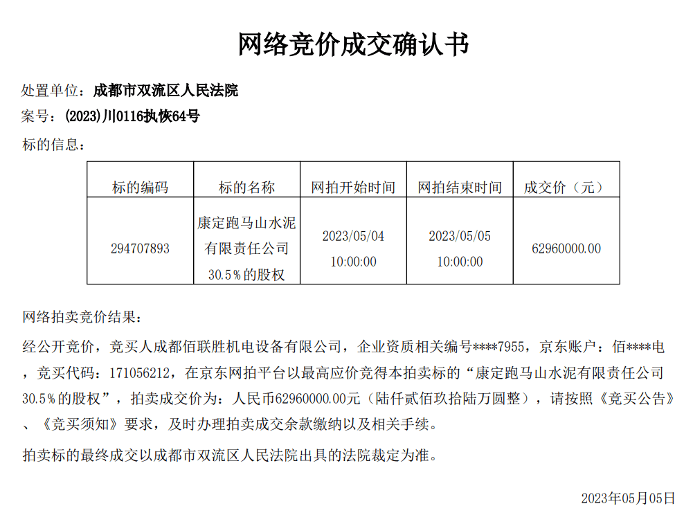 同期,康定跑馬山水泥有限責任公司30.5%的股權于5月5日被成功拍出,并未受到成都蓉聯水泥有限公司破產的影響。成交確認書顯示,經公開競價,競買人成都佰聯勝機電設備有限公司在京東網拍平臺以最高價競得本拍賣標的,拍賣成交價為6296萬元。