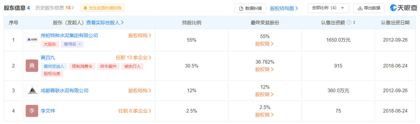 成都蓉聯水泥有限公司為何能影響康定跑馬山水泥有限責任公司的股權出售呢?從企業(yè)股權結構可見,康定跑馬山水泥有限責任公司由堯柏特種水泥持股55%,黃四九持股30.5%,成都蓉聯水泥有限公司持股12%,李文祥持股2.5%。