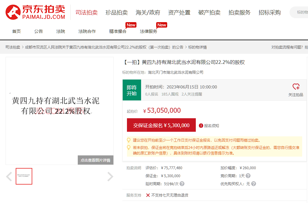 京東資產交易平臺另有信息顯示,黃四九持有的湖北武當水泥有限公司18%、22.2%的股權也即將拍賣,起拍價分別為4301萬元、5305萬元。湖北武當水泥有限公司成立于2006年,位于湖北省十堰市鄖西縣城關鎮(zhèn),該公司擁有一座2500t/d全能工廠。湖北武當水泥有限公司由黃四九持股99%。