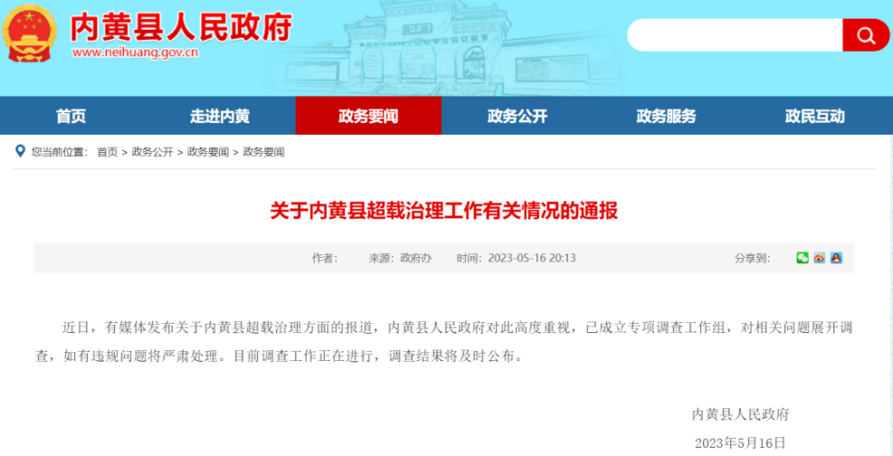 5月18日,內黃縣人民政府發布《關于反映內黃縣超載治理工作情況的調查通報》。