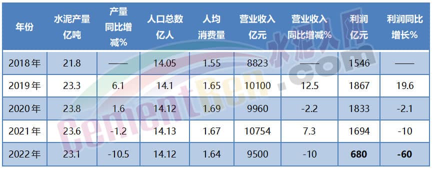從國(guó)家統(tǒng)計(jì)局近年來(lái)公布的建材行業(yè)經(jīng)濟(jì)運(yùn)行情況來(lái)看,水泥產(chǎn)量一直處于平臺(tái)期,人均消費(fèi)量在1.5~1.7噸之間,2018~2021年利潤(rùn)也多在1000億元左右,而2022年卻直降60%至680億。從數(shù)字上來(lái)看,需求并沒(méi)有大幅減少,但利潤(rùn)直線下跌。
