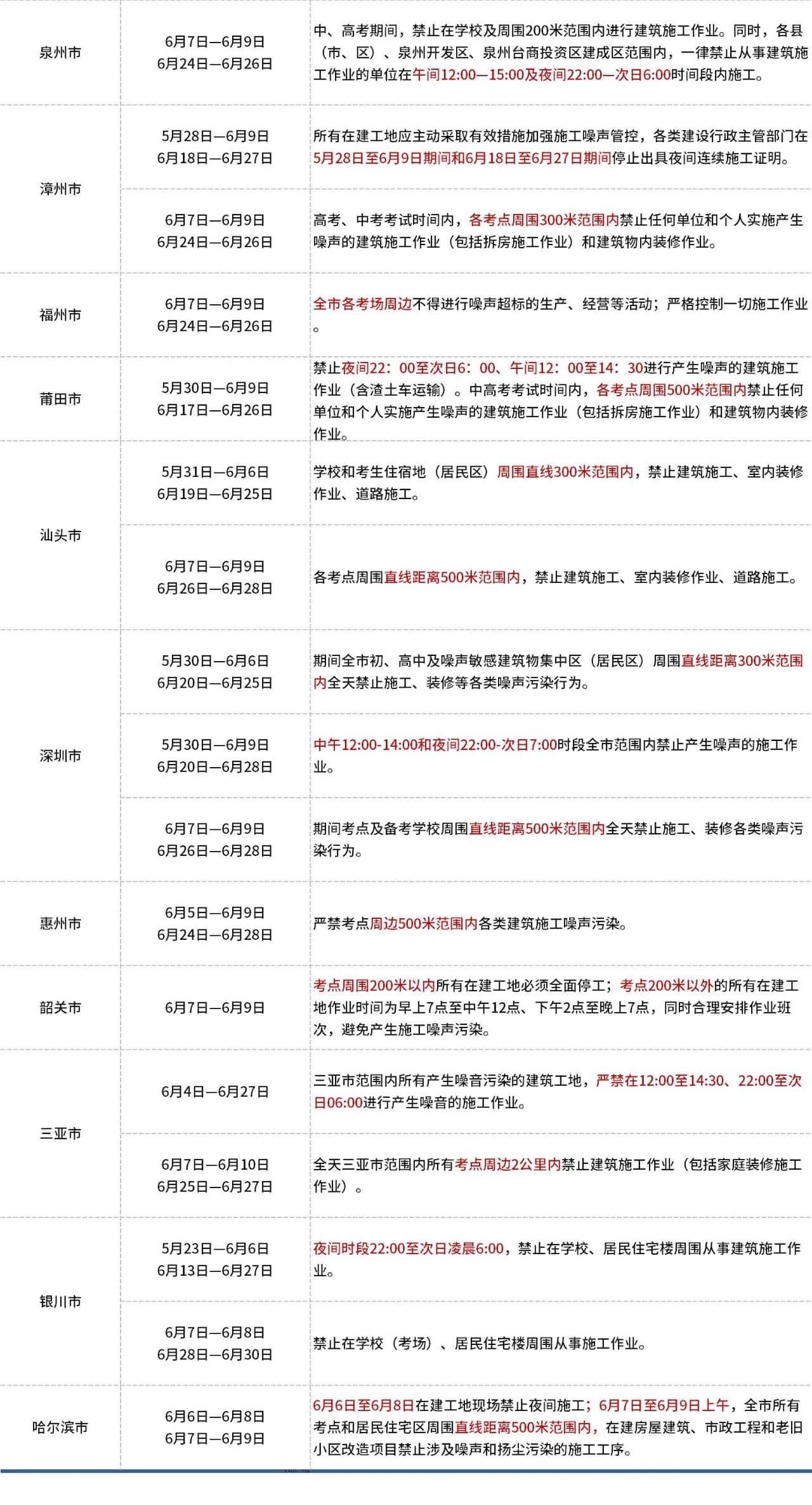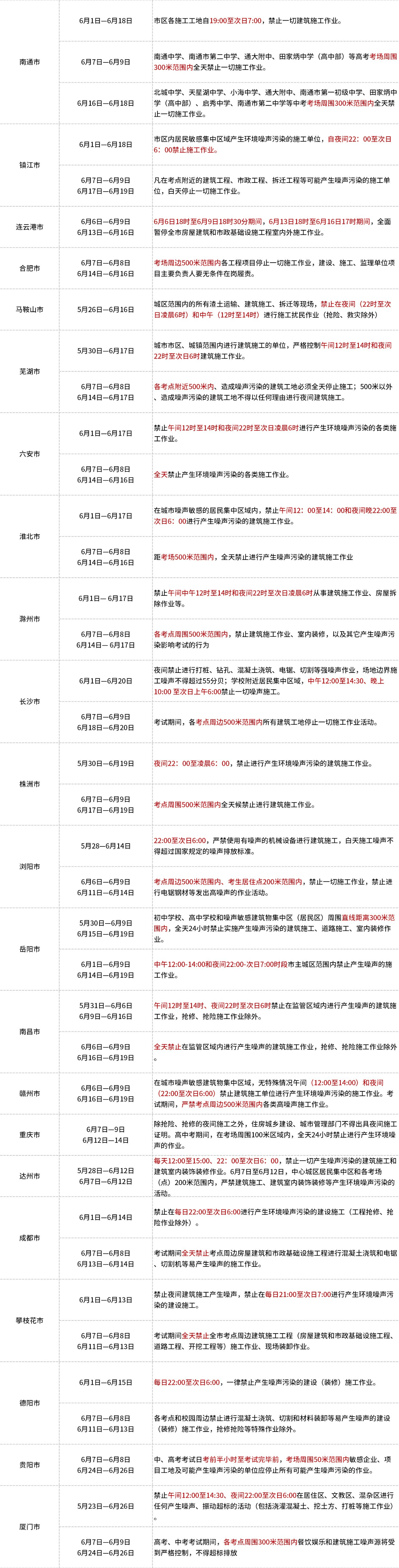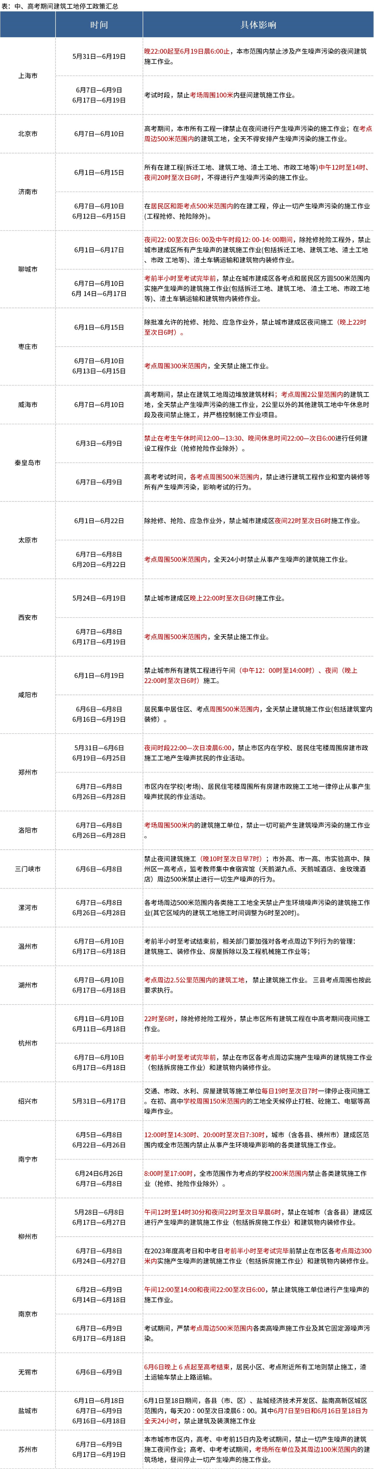 據(jù)市場反饋,為給廣大中、高考學(xué)生創(chuàng)造一個良好的復(fù)習(xí)迎考和考試環(huán)境,各地紛紛發(fā)出通知對所有建筑工地加強(qiáng)監(jiān)管工作。截至6月7日,共有57個城市發(fā)布了建筑工地停工最新政策。