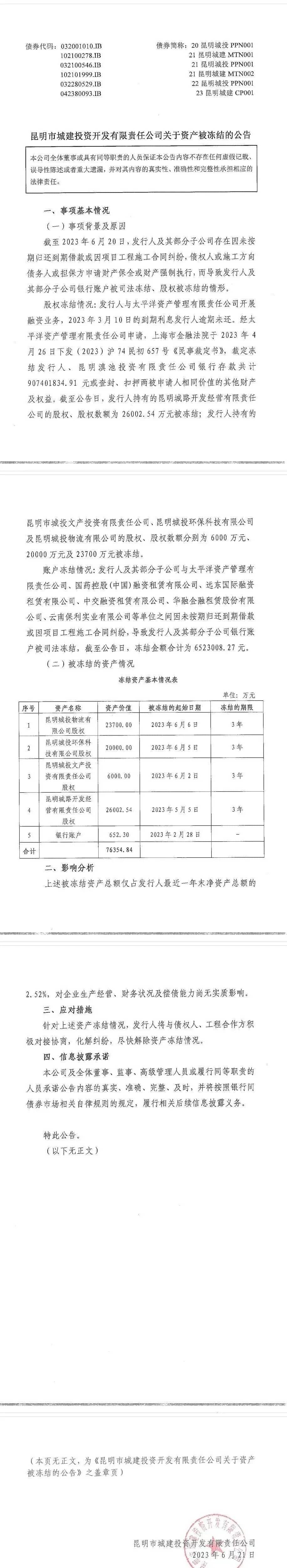 6月21日,昆明市城建投資開發(fā)有限責(zé)任公司發(fā)布公告,截至2023年6月20日,發(fā)行人及其部分子公司存在因未按期歸還到期借款或因項(xiàng)目工程施工合同糾紛,債權(quán)人或施工方向債務(wù)人或擔(dān)保方申請(qǐng)財(cái)產(chǎn)保全或財(cái)產(chǎn)強(qiáng)制執(zhí)行,而導(dǎo)致發(fā)行人及其部分子公司銀行賬戶被司法凍結(jié)、股權(quán)被凍結(jié)合計(jì)7.64億。