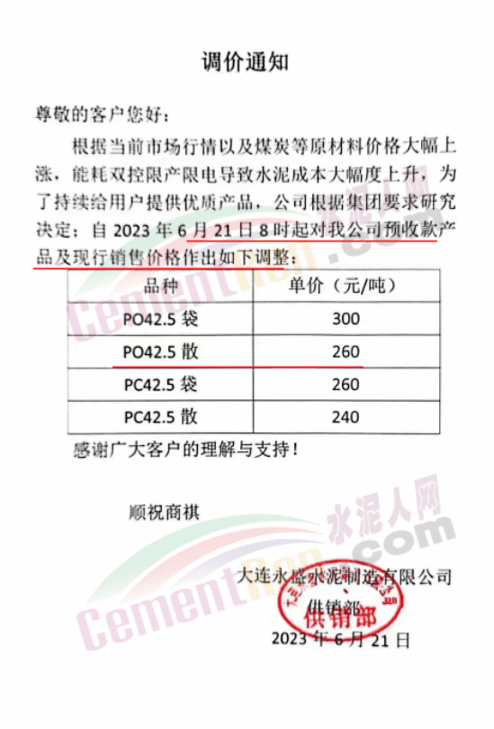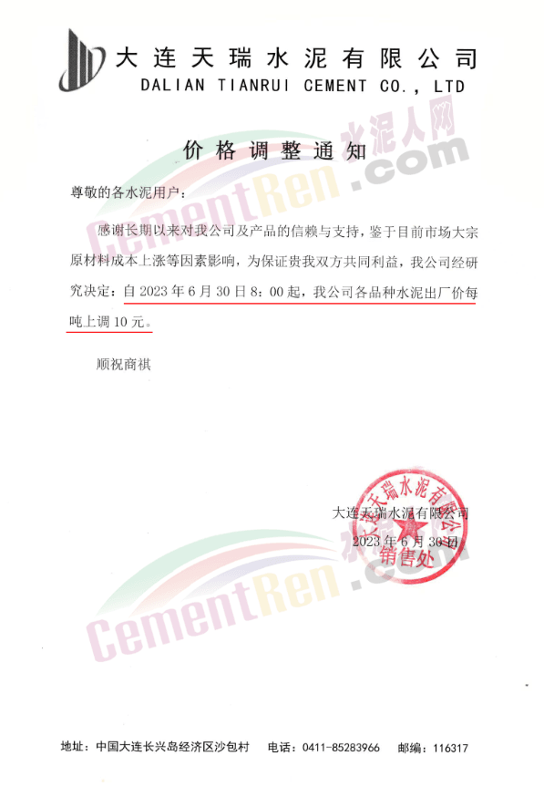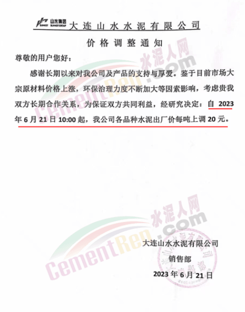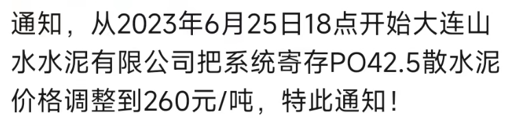 同期,大連天瑞水泥有限公司通知,鑒于目前市場(chǎng)大宗原材料成本上漲等因素影響,公司經(jīng)研究決定,自2023年6月30日8:00起,公司各品種水泥出廠價(jià)上調(diào)10元/噸。
