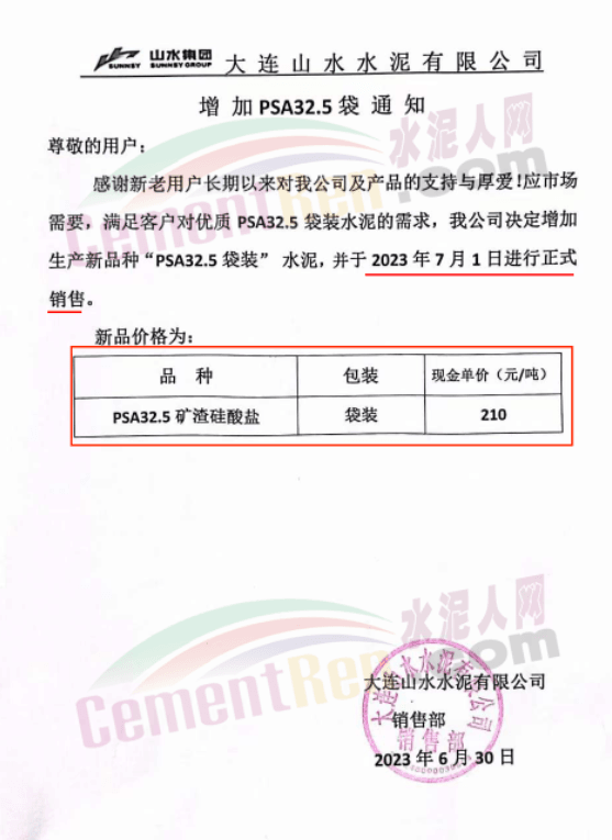 大連山水水泥有限公司6月30日發(fā)布的通知,還包括于今日(2023年7月1日是)起推出低標(biāo)號(hào)P.S.A32.5礦渣硅酸鹽袋裝水泥,新品報(bào)價(jià)210元/噸。