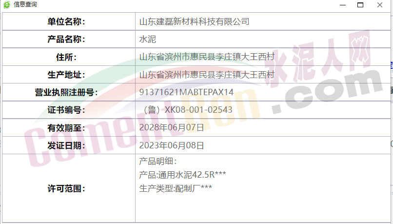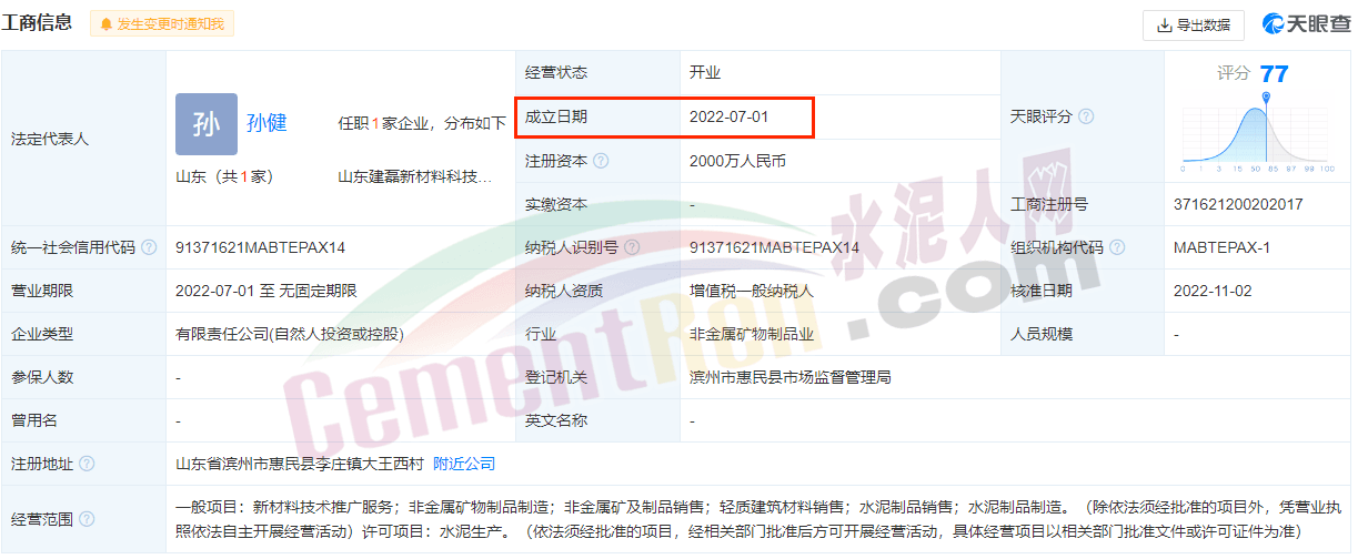 據(jù)查詢(xún)山東建磊新材料科技有限公司于2022年7月1日成立,截至7月1日剛好成立一年。企業(yè)注冊(cè)信息顯示,經(jīng)營(yíng)范圍為新材料技術(shù)推廣服務(wù);非金屬礦物制品制造;非金屬礦及制品銷(xiāo)售;輕質(zhì)建筑材料銷(xiāo)售;水泥制品銷(xiāo)售;水泥制品制造,許可項(xiàng)目為水泥生產(chǎn)。