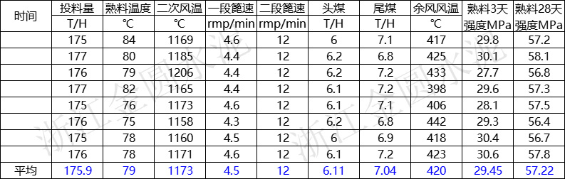二次風溫:平均值≥1150,中控顯示數據(產量:2800-3000t/d);
