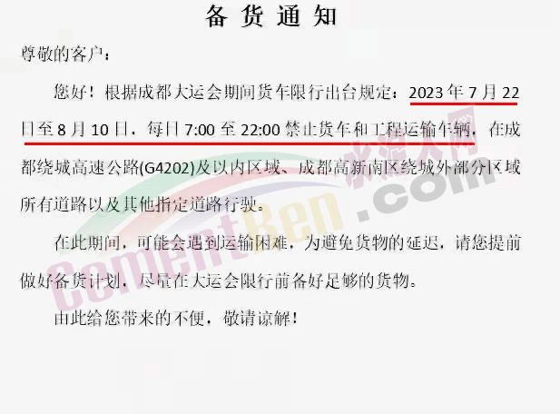 水泥人網注意到,由于成都大運會的原因,經銷商在附件中除了調價通知外還有一份備貨通知。備貨通知中提到。7月22日至8月10日期間每天7時至22時禁止貨車和工程運輸車輛在成都繞城高速及以內區域、成都高新南區繞城外部分區域所在道路以及其他指定道路行駛。在此期間可能會遇到運輸困難,為避免貨物的延遲,請客戶提前做好備貨計劃,盡量在限行前備好足夠貨物。