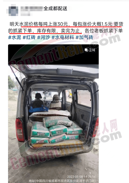 另有成都經銷商通知:每噸漲30元,每包漲約1.5元,要貨的抓緊下單,庫存有限,賣完為止……