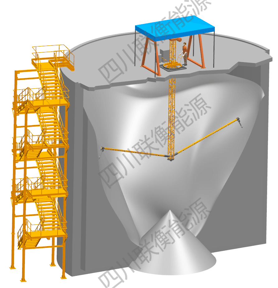 高比強(qiáng)度材料和機(jī)械臂構(gòu)型設(shè)計(jì),解決了設(shè)備自重和大空間部署的矛盾。只需在水泥庫(kù)頂近中央部3米范圍內(nèi)開(kāi)孔1米,即可安裝設(shè)備入庫(kù)清理。模組化機(jī)械臂可適應(yīng)各尺寸水泥庫(kù)。