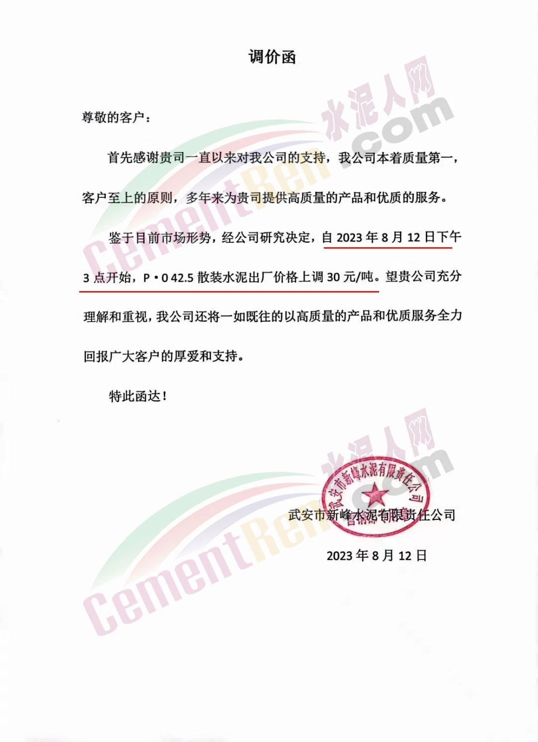 日前,武安市新峰水泥有限責任公司通知,鑒于目前市場形勢,經(jīng)公司研究決定,自2023年8月12日下午3點開始,P.O42.5散裝水泥出廠價格上調(diào)30元/噸。