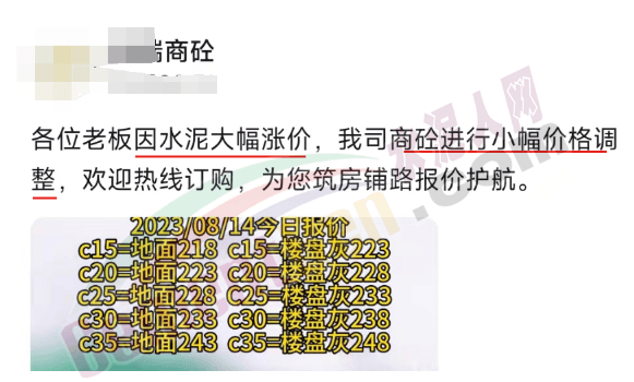 某商砼企業(yè)通知,因水泥大幅漲價,商砼進行小幅價格調(diào)整。調(diào)整后C30地面233元/方,樓盤灰238元/方。