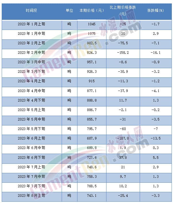 煤炭價格方面,繼6月中旬開始回暖后至8月上旬再次下滑25.4元/噸。市場貿(mào)易商表示,立秋之后天氣轉(zhuǎn)涼,電廠用煤量下降。同時遇水泥、鋼鐵等市場淡季,貿(mào)易商囤貨意愿不強,煤價失去支撐回落。以山西大混(5000大卡)為例,2023年6月中旬持續(xù)5期連漲后,至2023年8月上旬回落25.4元/噸至743.1元/噸。