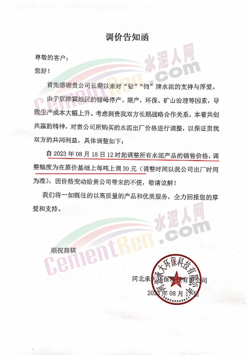 河北承大環保科技有限公司通知,由于京津冀地區的錯峰停產、限產,環保、礦山治理等因素,導致生產成本大幅上升。自2023年8月18日12時起調整所有水泥產品的銷售價格,調整幅度為在原價基礎上每噸上調30元。
